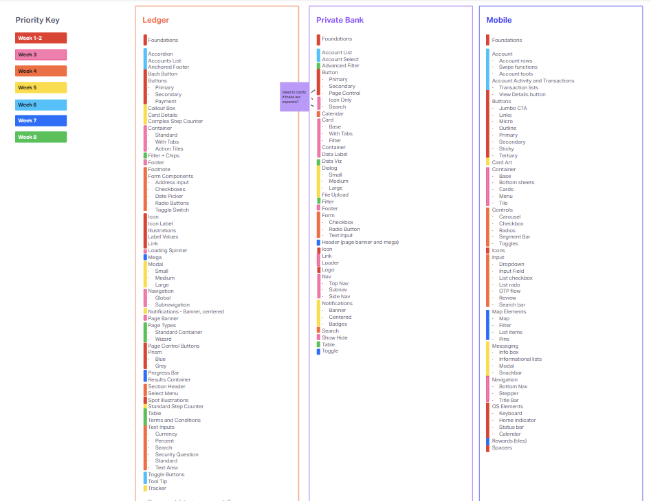 To kick off the project, I met with 3 members of design leadership and representatives from each design system to prioritize the components and determine the timeline. The initial scope was one 2 week sprint to audit the Sketch libraries and 8 weeks to rebuild all 3 systems.