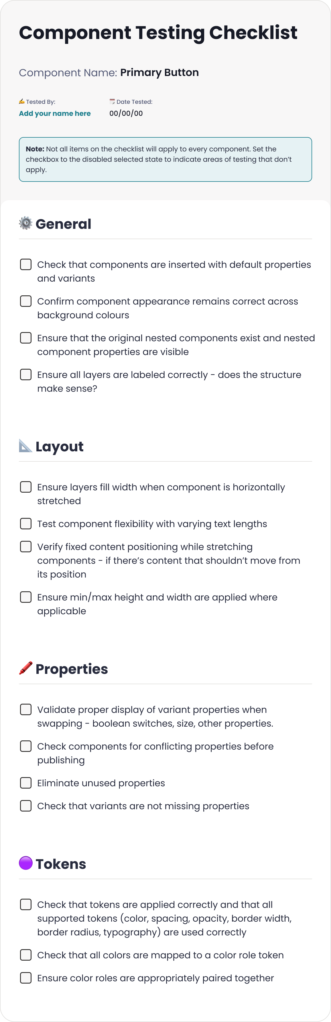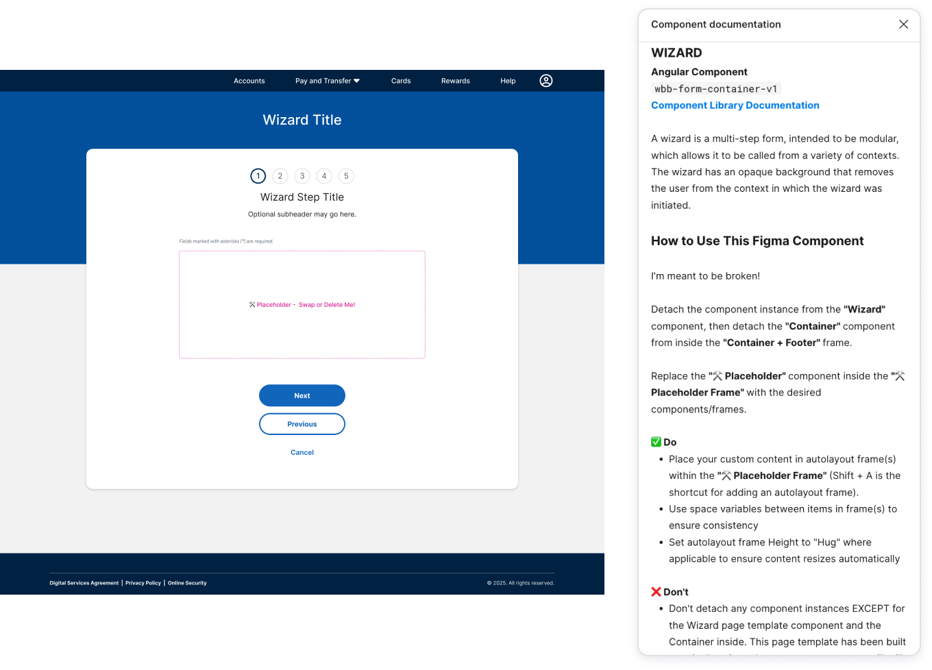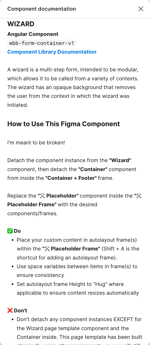 As a design systems team, we worked together to create a repeatable notes template that could be used for all Figma components. I took the opportunity to add guidelines to help designers learn how to use the Figma components, especially for new concepts they would need to learn in Figma, such as components with slots.