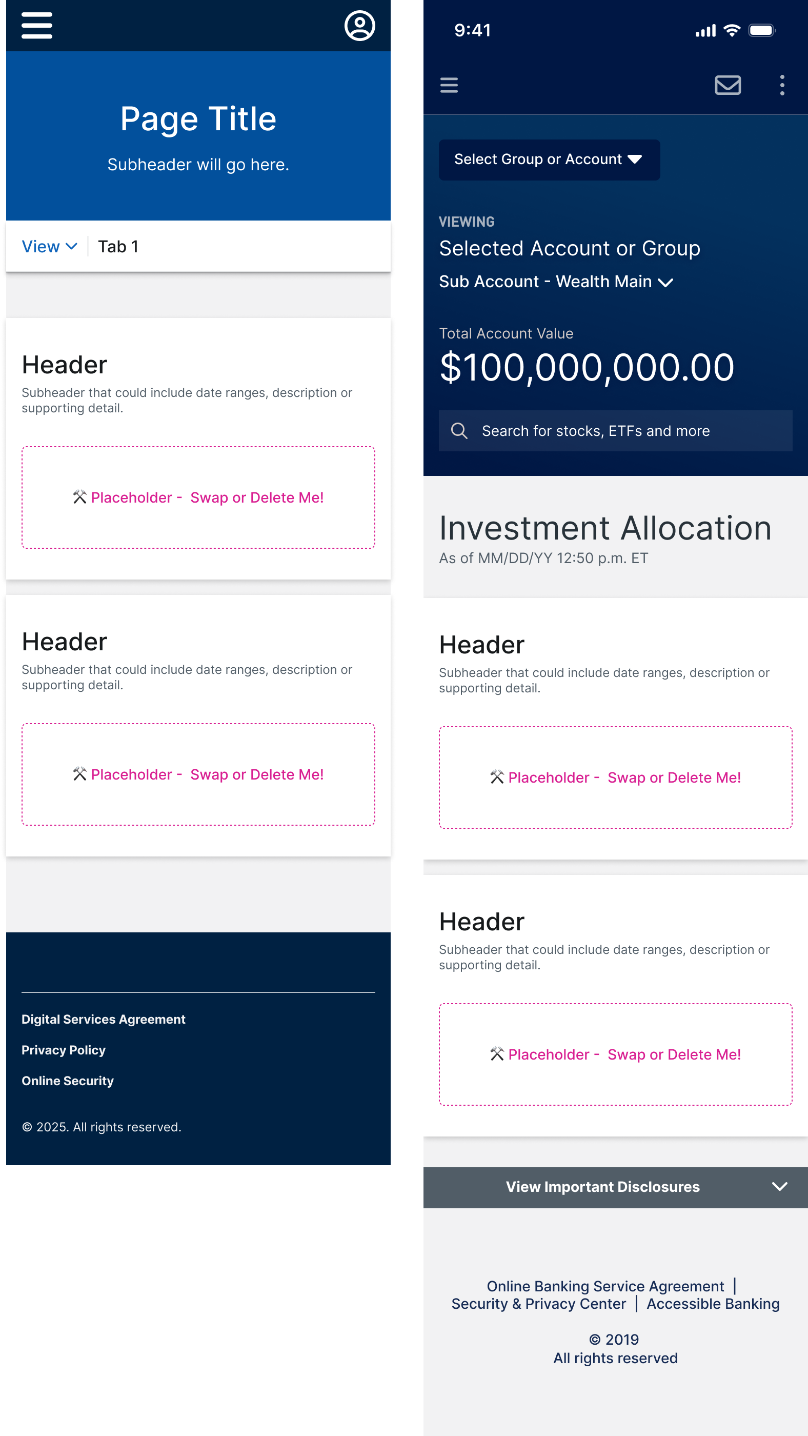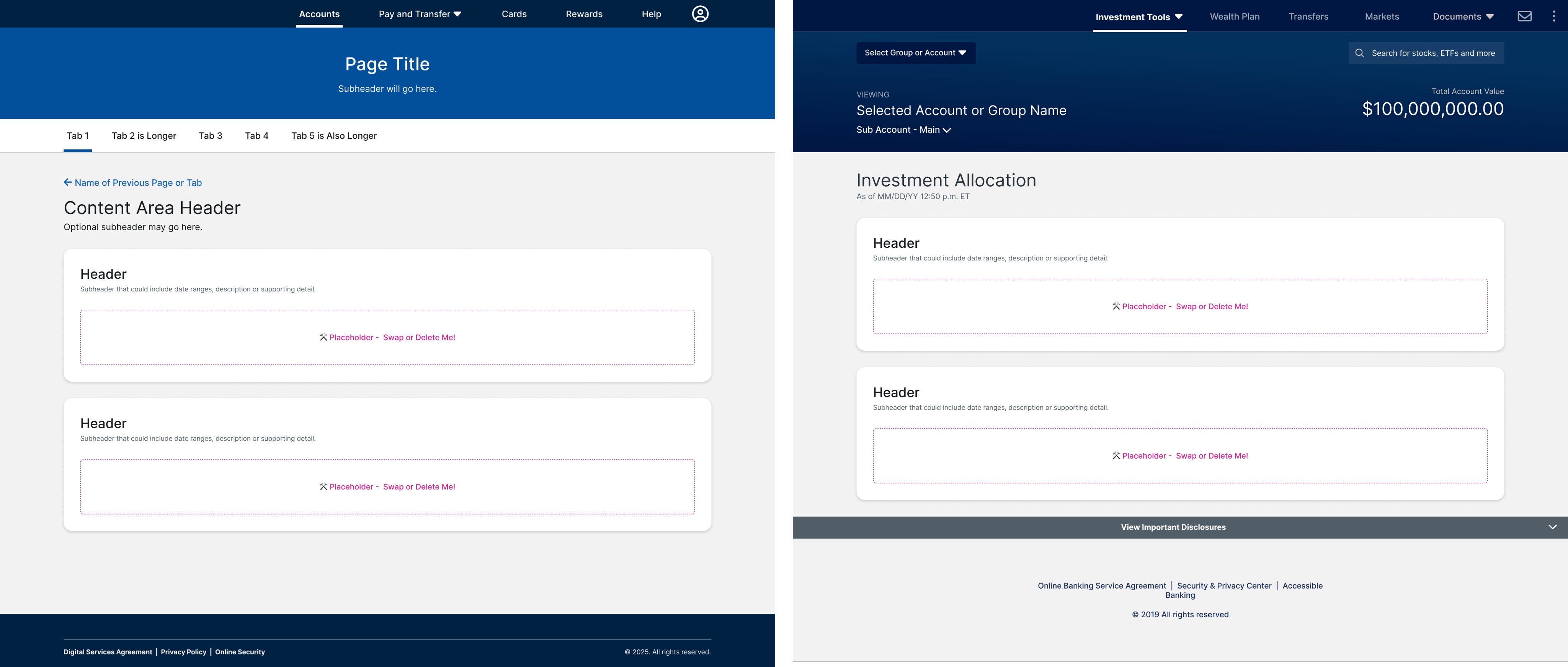 An example of standard page templates for the Retail system (left) and Wealth (right).